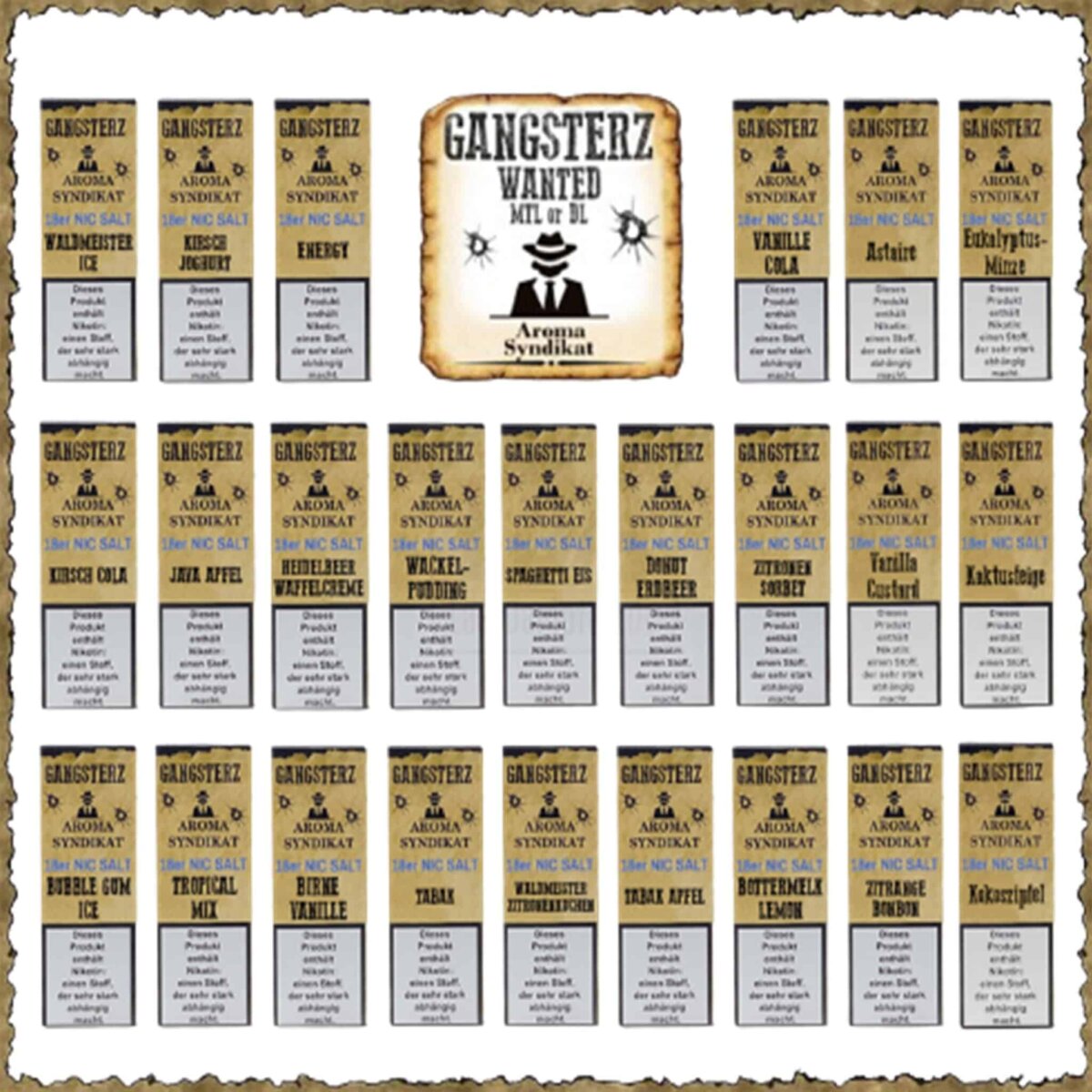 - Die Anzahl der Flaschen mit 10 ml Nikotinsalz aus der Reihe der Gangsterz Nic Salt, im Geschmack Ihrer Wahl.
